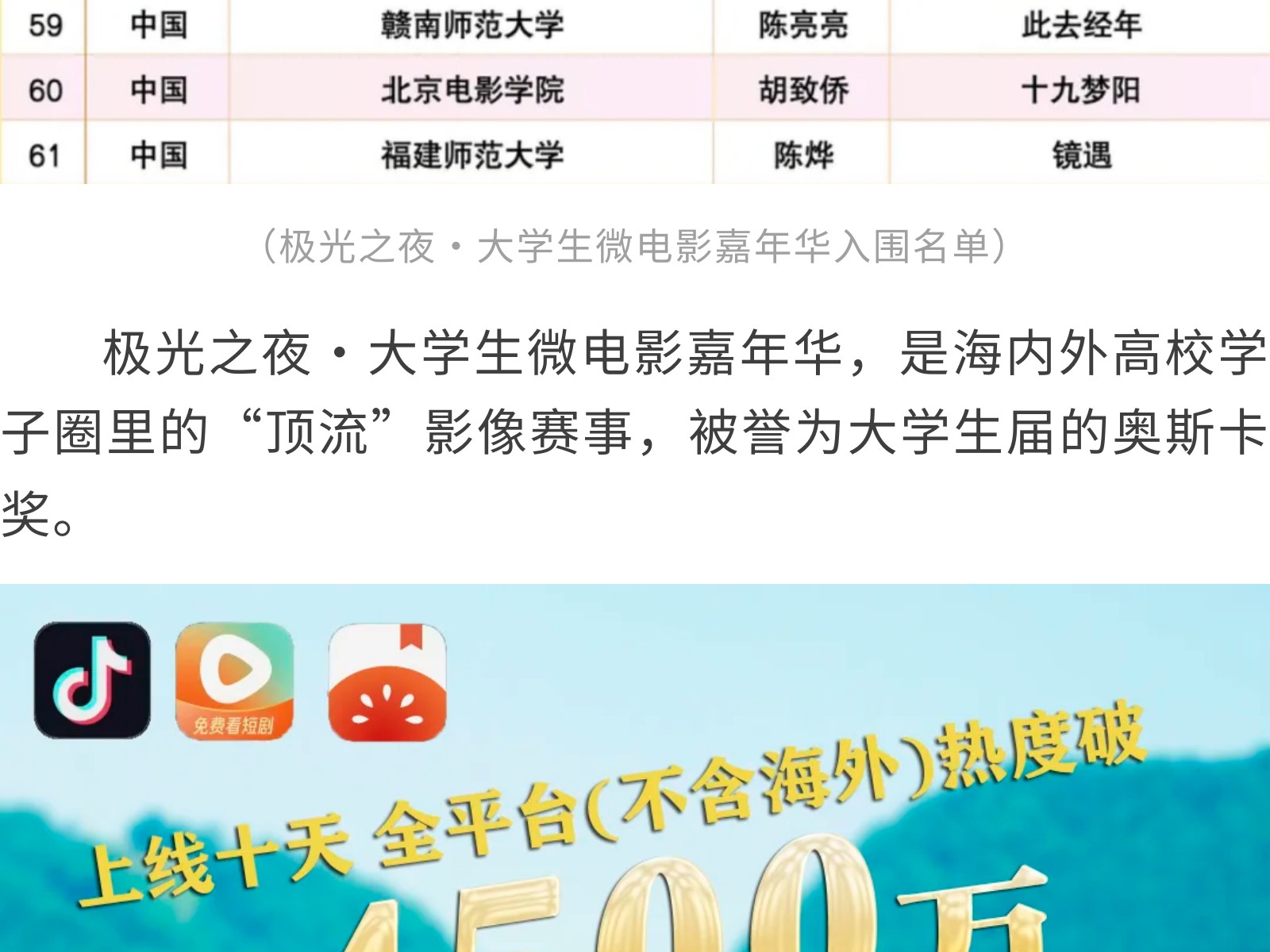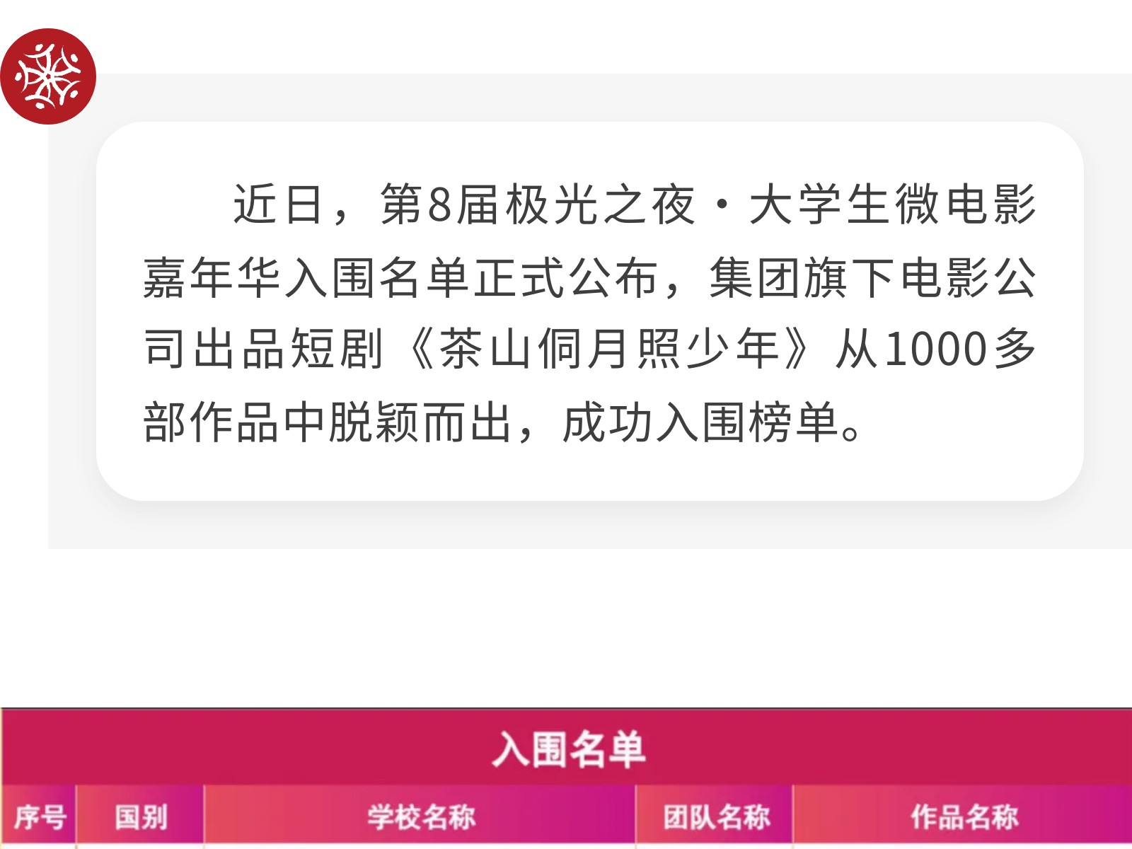 喜報(bào)!集團(tuán)旗下電影公司出品短劇《茶山侗月照少年》入圍第8屆極光之夜·大學(xué)生微電影嘉年華 發(fā)布時(shí)間:2025年10月14日 15時(shí)來(lái)源:本站原創(chuàng)瀏覽:89 人次