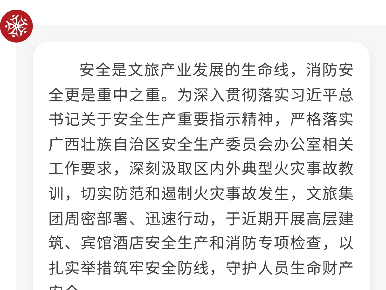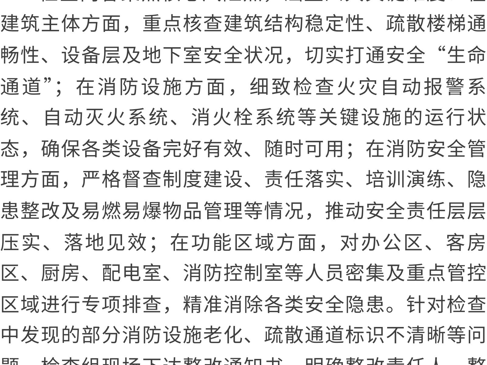 【繃緊安全之弦 筑牢防護(hù)屏障】文旅集團(tuán)開展高層建筑及賓館酒店安全生產(chǎn)消防專項檢查 發(fā)布時間:2025年12月11日 10時來源:本站原創(chuàng)瀏覽:14 人次