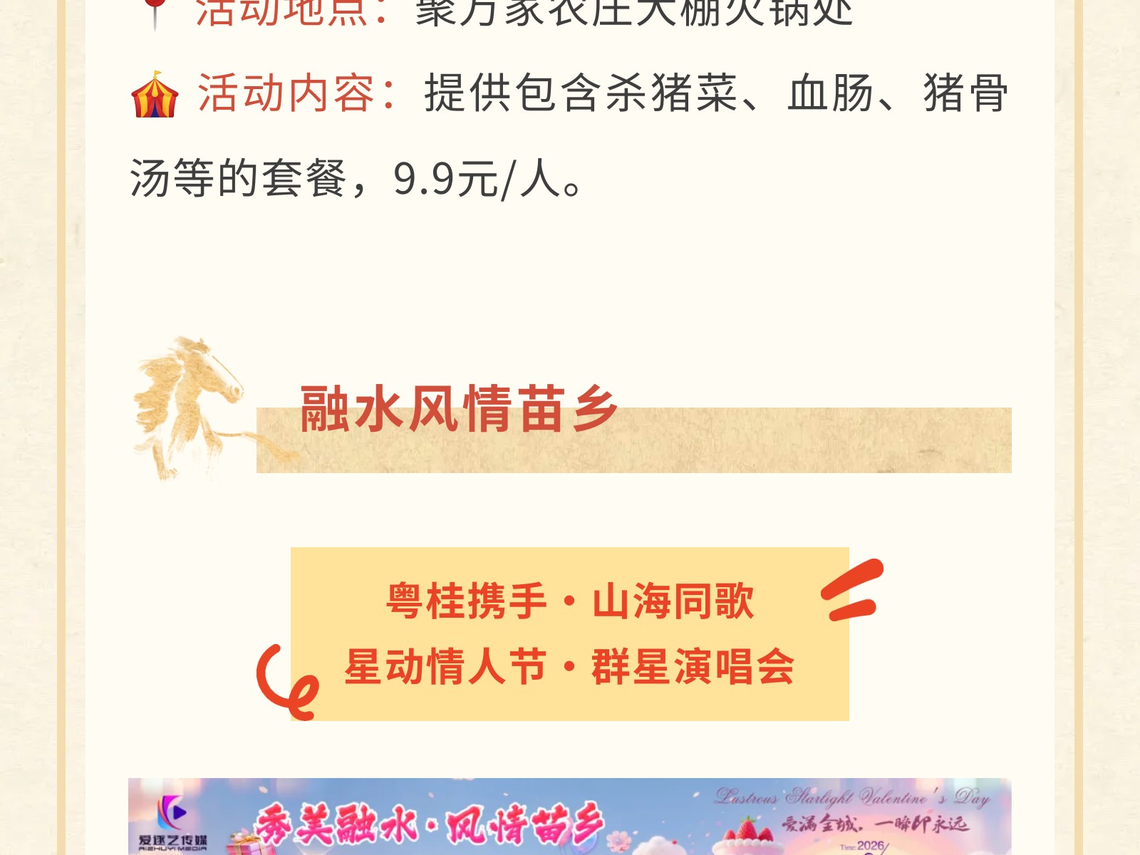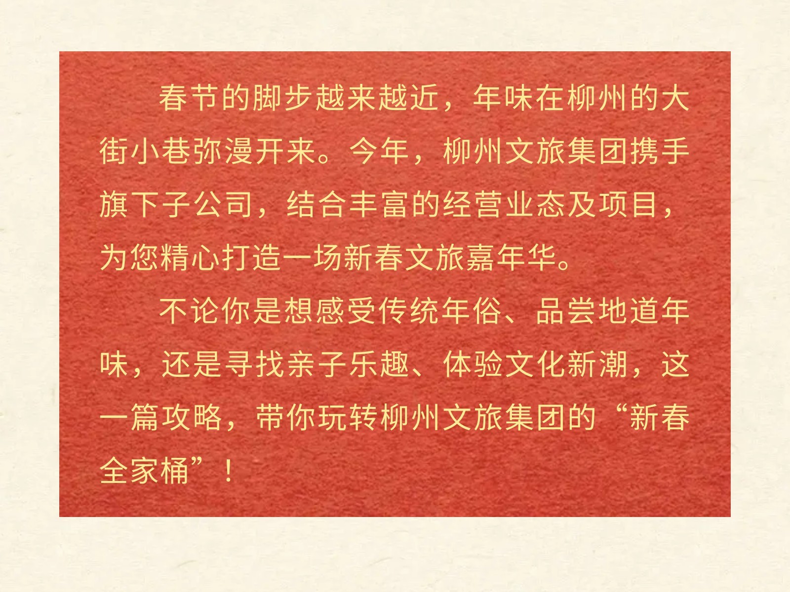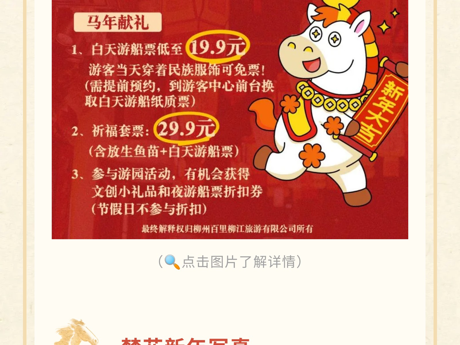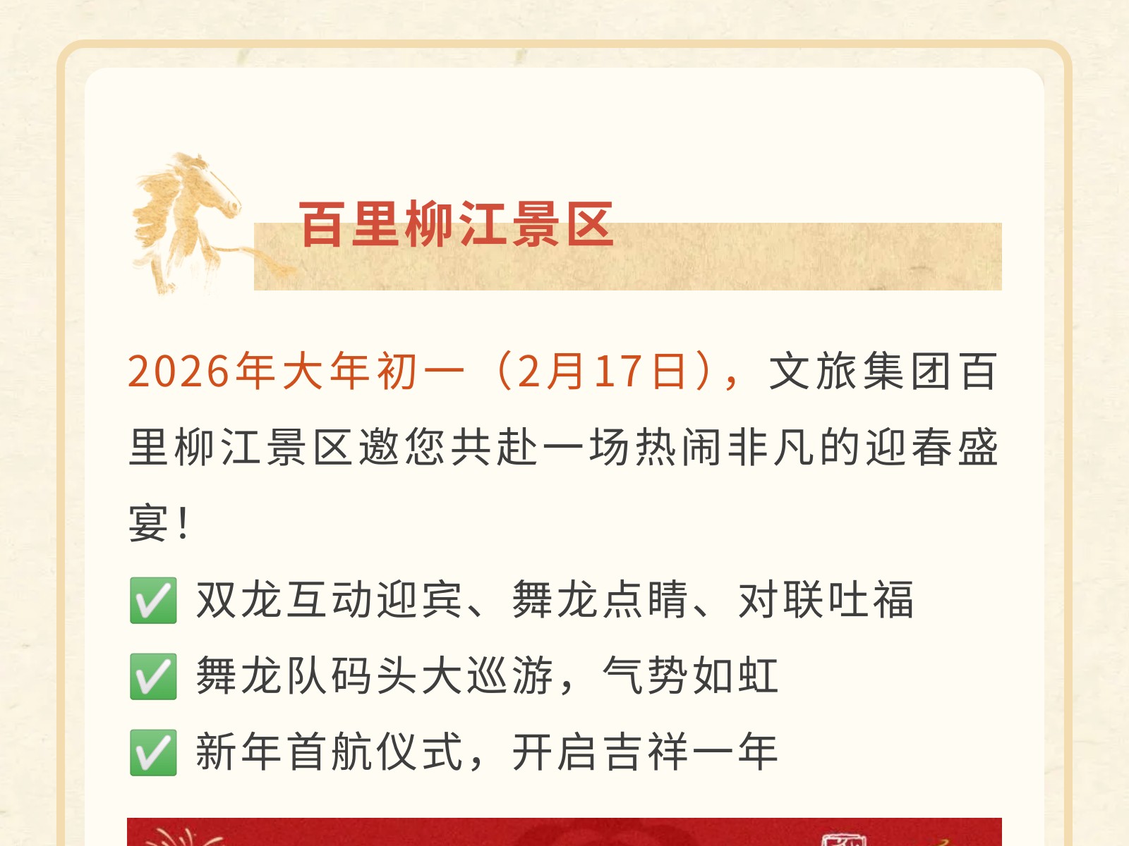 【駿馬奔騰·文旅賀歲】2026文旅集團(tuán)新春游樂(lè)指南,承包你的團(tuán)圓與歡樂(lè)! 發(fā)布時(shí)間:2026年01月30日 15時(shí)來(lái)源:本站原創(chuàng)瀏覽:81 人次