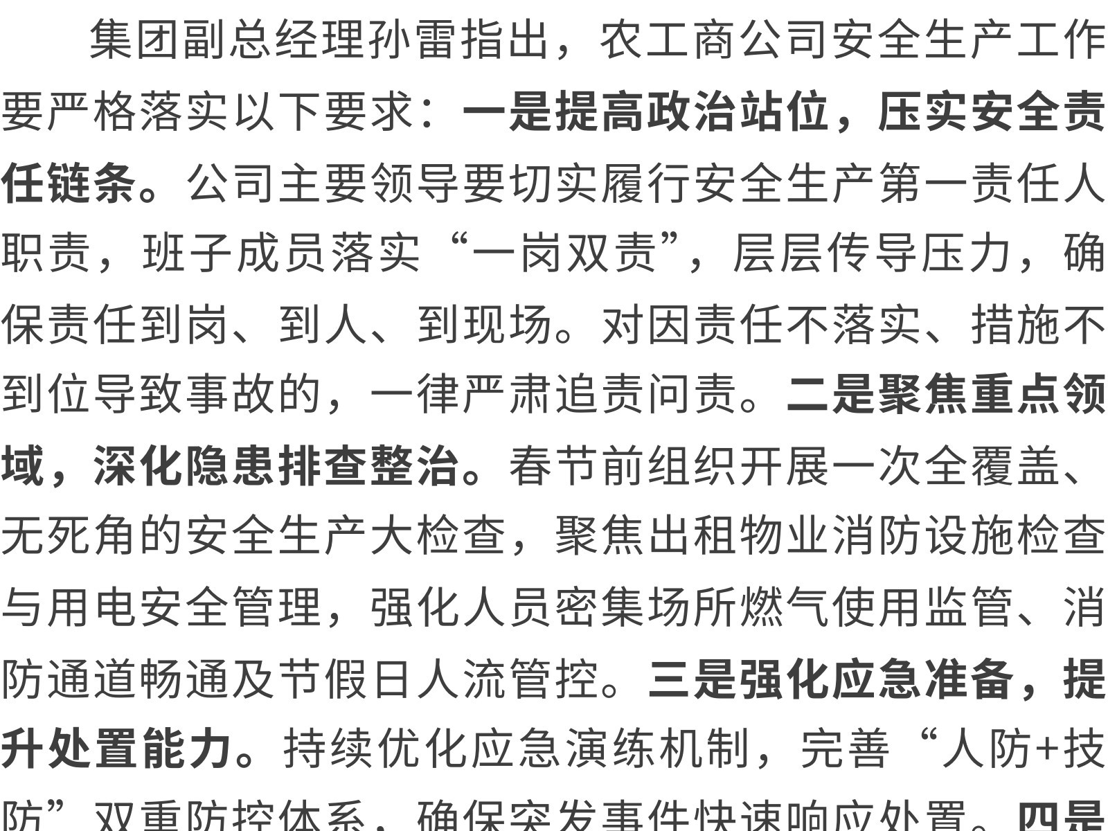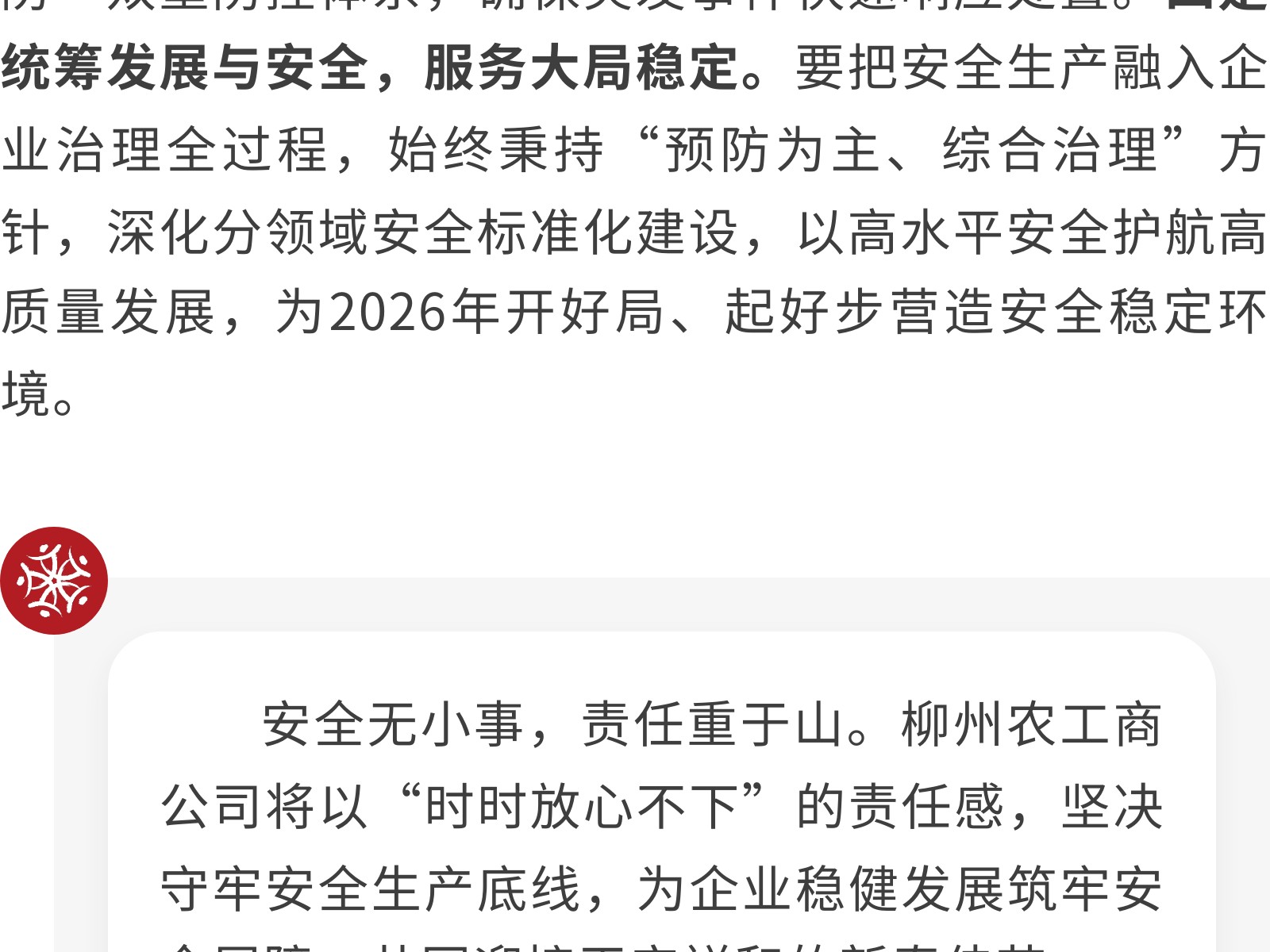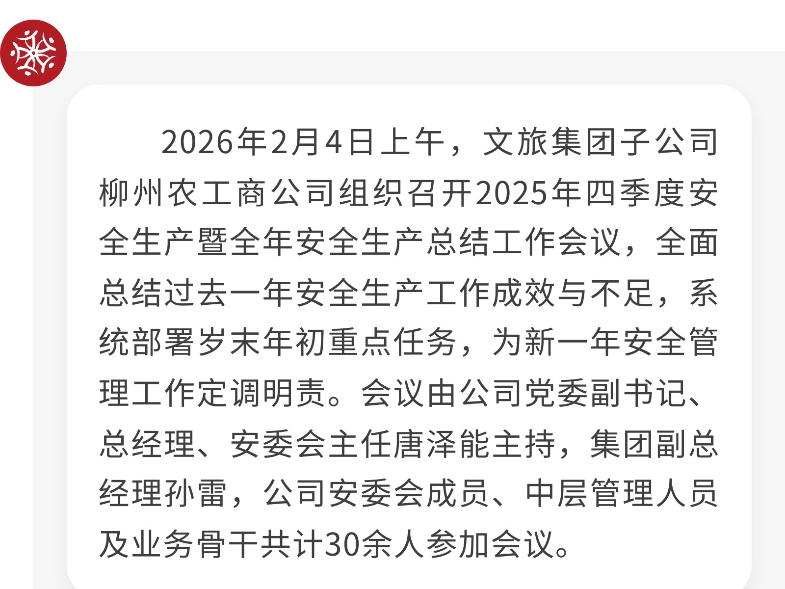 壓緊責任鏈條,筑牢歲末年初安全防線——柳州農(nóng)工商公司召開2025年度安全生產(chǎn)總結(jié)會 發(fā)布時間:2026年02月06日 12時來源:本站原創(chuàng)瀏覽:51 人次