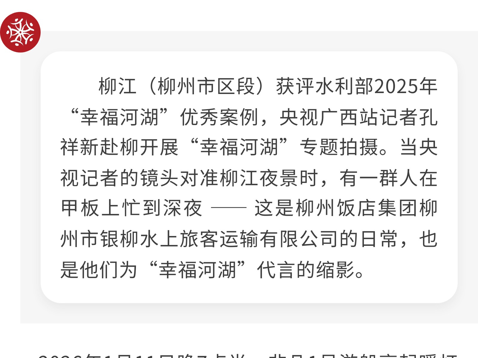 央視鏡頭柳江美,銀柳水上暖心扉 發(fā)布時(shí)間:2026年02月06日 13時(shí)來(lái)源:本站原創(chuàng)瀏覽:44 人次