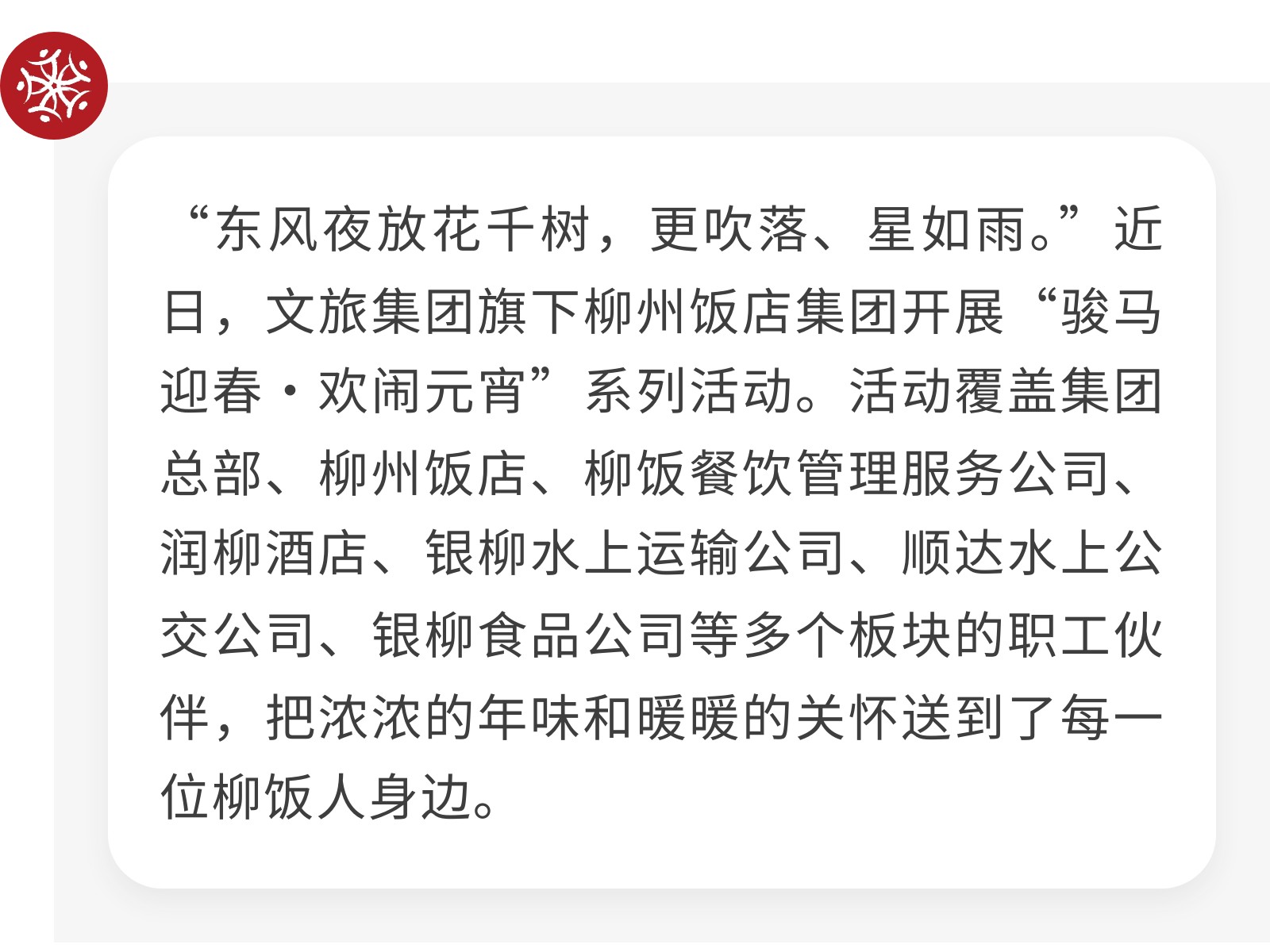 融傳統(tǒng)雅韻 聚奮進(jìn)合力——柳州飯店集團(tuán)“駿馬迎春?歡鬧元宵”系列活動(dòng)順利舉辦 發(fā)布時(shí)間:2026年03月06日 10時(shí)來(lái)源:本站原創(chuàng)瀏覽:46 人次