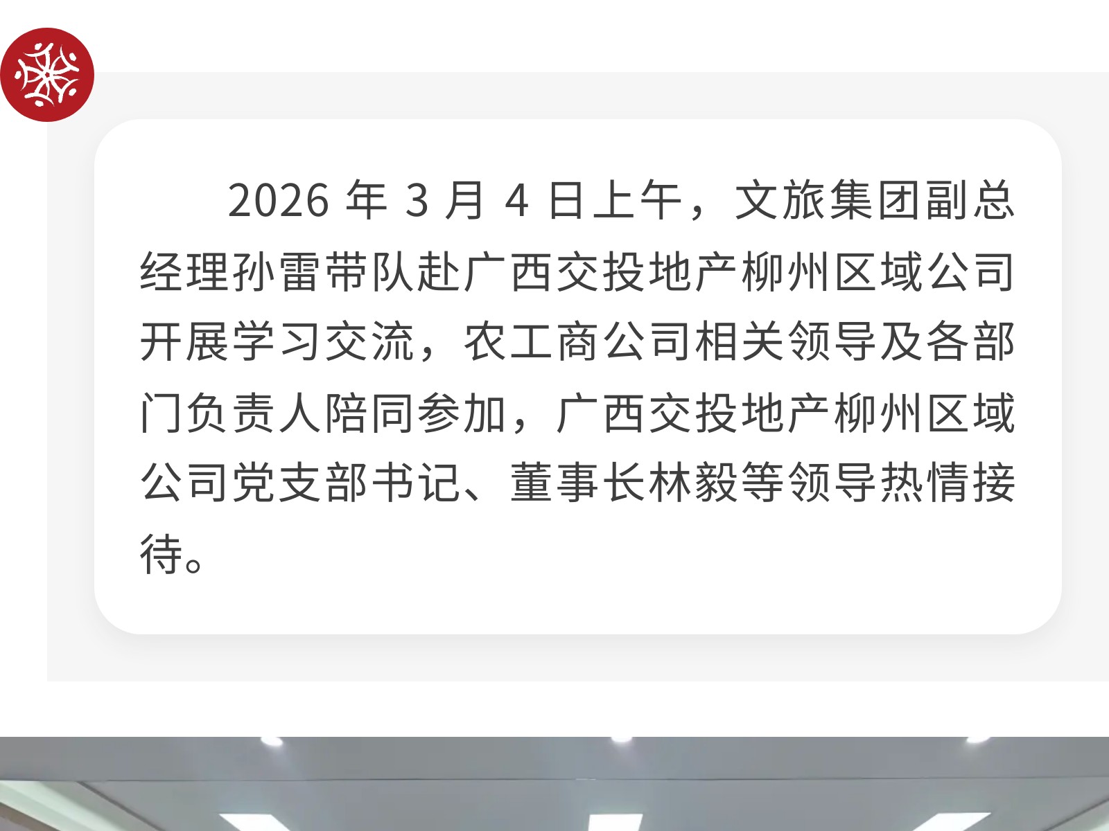 深化交流謀合作 攜手共贏促新局——文旅集團(tuán)副總經(jīng)理孫雷帶隊到廣西交投地產(chǎn)柳州區(qū)域公司開展學(xué)習(xí)交流 發(fā)布時間:2026年03月10日 09時來源:本站原創(chuàng)瀏覽:49 人次