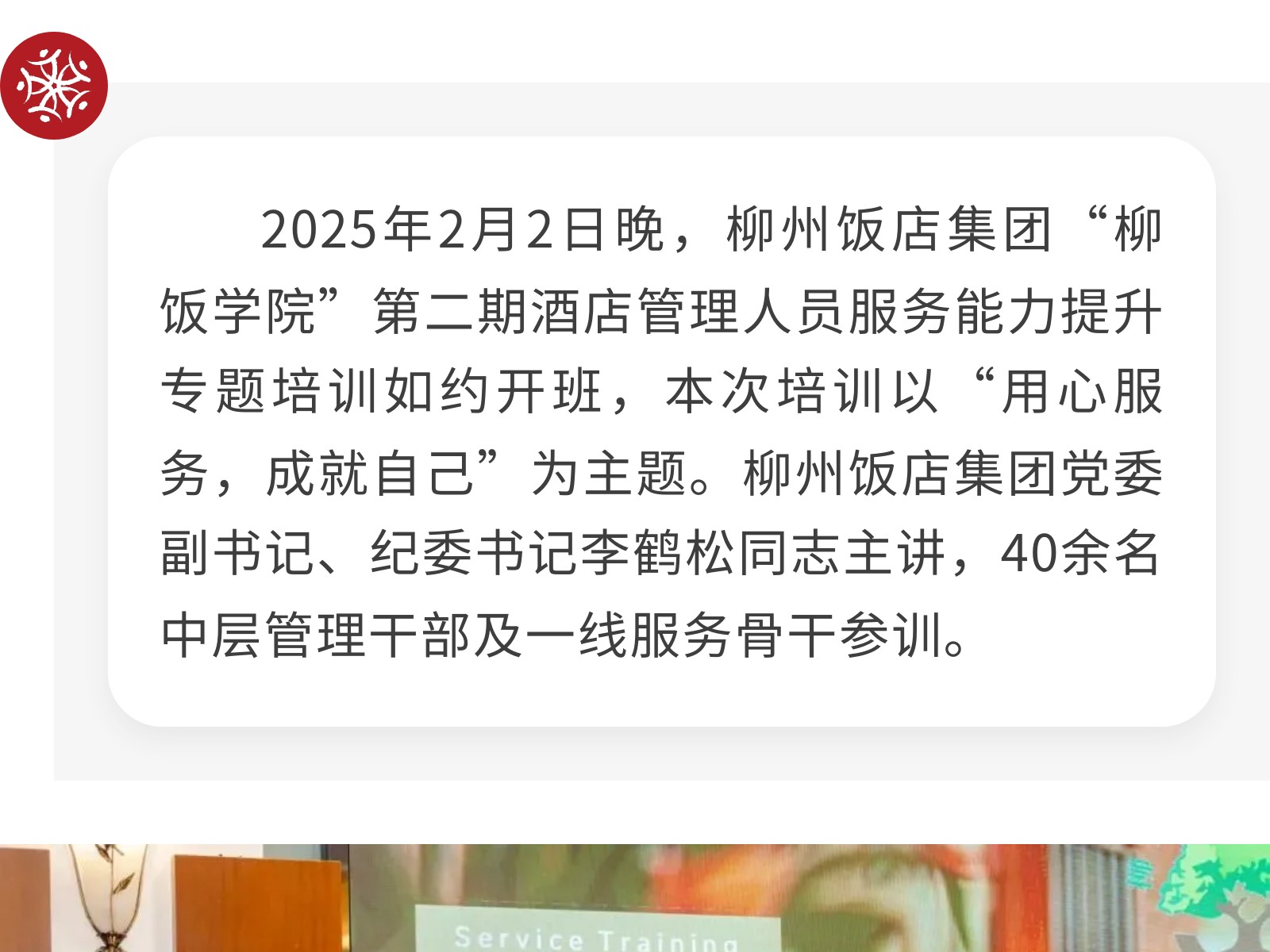 精耕服務啟新程,聚力向善謀突破——柳州飯店集團開展“用心服務,成就自己”酒店管理人員服務能力提升專題培訓 發(fā)布時間:2026年02月13日 13時來源:本站原創(chuàng)瀏覽:75 人次