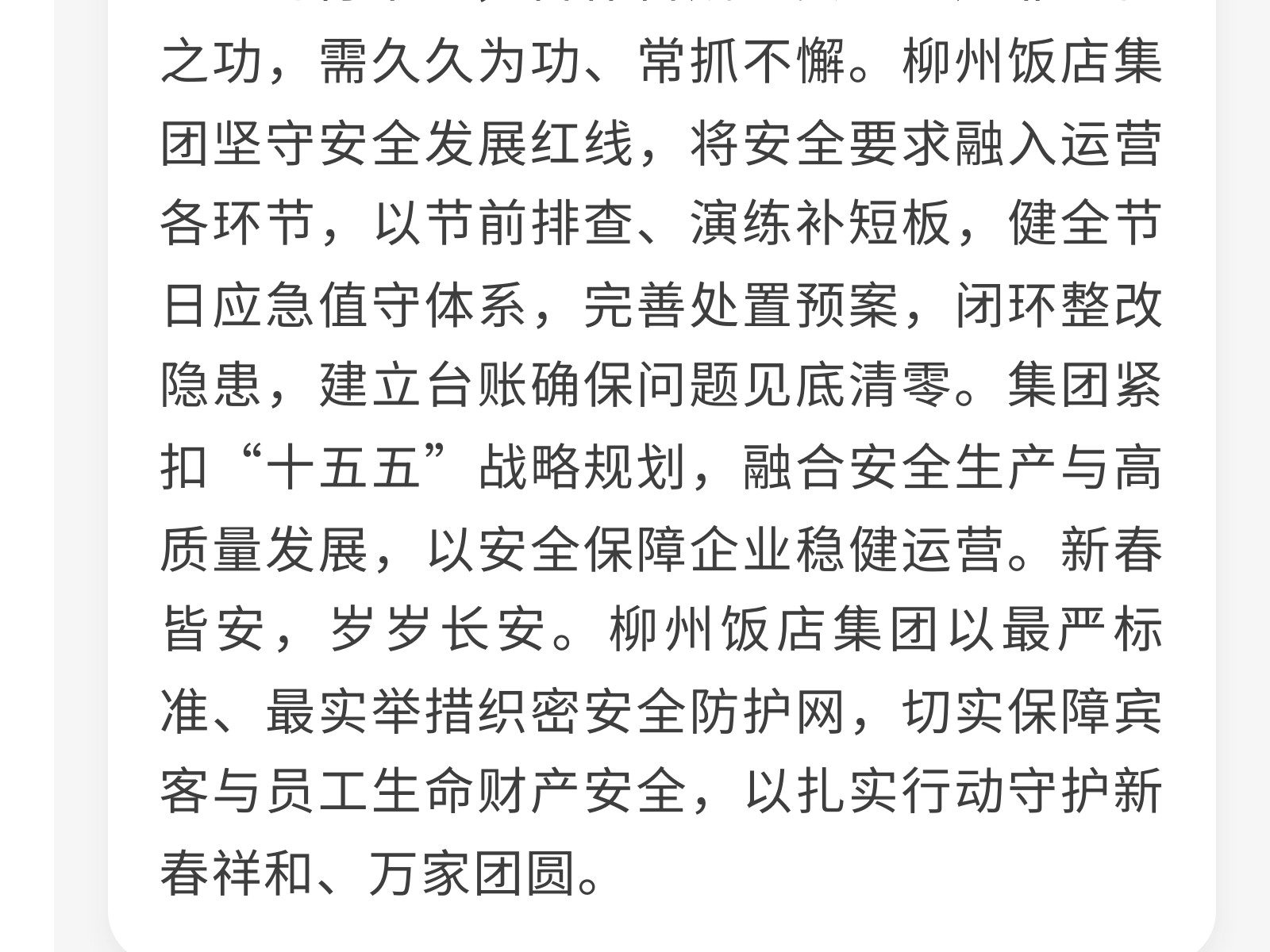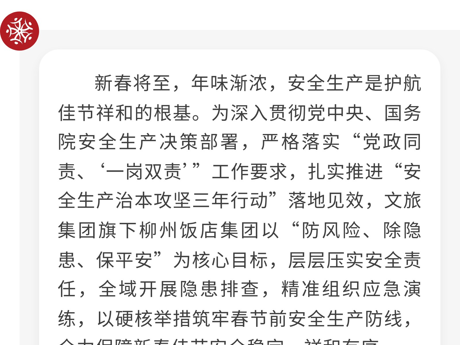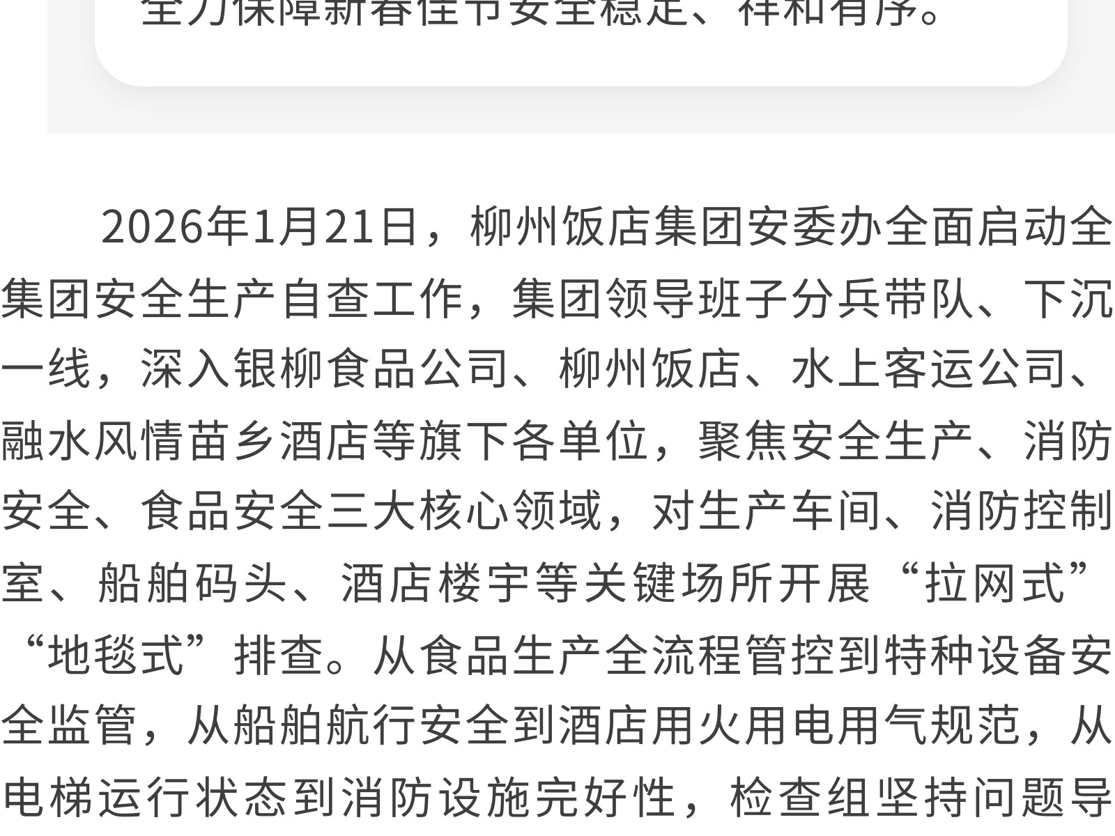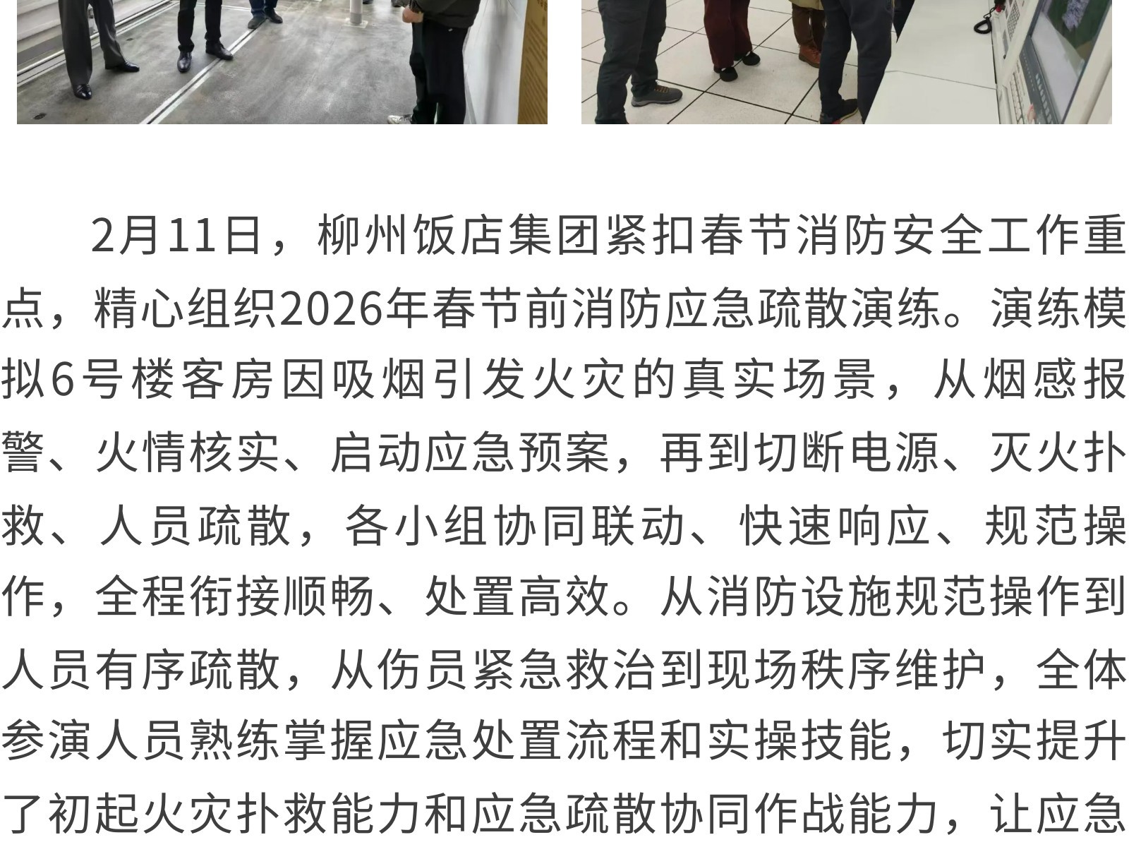 織密安全防護網(wǎng) 護航新春平安年——柳州飯店集團開展春節(jié)前安全生產(chǎn)系列活動 發(fā)布時間:2026年02月13日 13時來源:本站原創(chuàng)瀏覽:84 人次